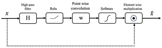 Proposed high-frequency attention gate. The figure illustrates the attention gate module, which enhances feature representation in neural networks by incorporating spatially adaptive attention weights. It shows the flow of operations, including high-pass filtering, ReLU activation, convolutional operations for attention weight computation, softmax normalization, element-wise multiplication, and feature fusion. The attention gate selectively highlights important regions while suppressing less relevant areas, improving the model’s ability to capture fine-grained details.