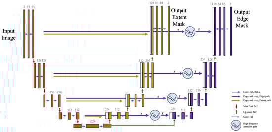 The final network architecture seen in Figure 5 incorporates attention gates, following the methodology proposed by Oktay et al. []. These attention gates are strategically placed prior to the concatenation of cropped features and upscaled features, in the expanding path responsible for the edge mask. This allows for the effective integration of attention-based feature vectors within the U-Net framework. The resulting feature vector from the attention mechanism is then combined with the upscaled feature vector, a common practice in U-Net architectures.