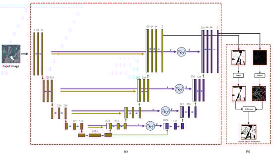 Before deep learning, the primary methods for boundary delineation relied on edge detection techniques. For instance, Graesser and Ramankutty utilized multi-spectral and multi-temporal edge extraction combined with histogram equalization for unsupervised boundary delineation []. Furthermore, Fetai et al. grounded their boundary delineation strategy on the edges derived from the Sobel operator, an edge detection filter []. Another study capitalized on both multi-temporal and multi-spectral data to craft and refine closed parcel boundaries. This was achieved by harnessing the outcomes of an edge extraction algorithm, as detailed by Cheng et al. [].