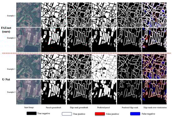 Figure 11 provides a comprehensive view of the outcomes for both FAUNet and the conventional U-Net model. It includes input images, ground-truth parcels, and ground-truth edge masks. The final column visually represents error metrics, showing true positives, false negatives, and false positives, with a specific focus on boundary pixels. To enhance clarity, we have implemented a color-coded scheme. White pixels indicate agreement between the output edge mask and the ground truth, while red pixels represent edge pixels that are present in the ground truth but missing in the model’s prediction. Conversely, blue pixels represent pixels present in the model’s output but not in the ground truth. This color scheme effectively illustrates the substantial impact of the frequency attention mechanism on performance. Figure 11 demonstrates the improvements in FAUNet’s performance compared to the conventional U-Net. In the error visualization of FAUNet, white pixels predominate, signifying a significant presence of true positives, with fewer occurrences of blue and red pixels. Conversely, the U-Net visualization has fewer white pixels and more red and blue pixels, indicating a higher occurrence of false positives and false negatives. In a comprehensive assessment, FAUNet exhibits a noteworthy advantage over the conventional U-Net in both recall and precision. When closely examining the error visualization, FAUNet consistently demonstrates superior recall, marked by a pronounced abundance of true positives, affirming its proficiency in capturing the finer details within the edge masks.