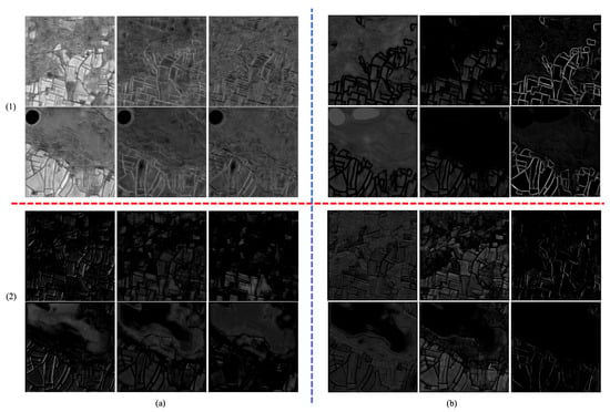 U-Net and FAUNet feature map comparison. (1) FAUNet feature maps, (2) U-Net feature map, (a) third upscaling layer from the edge expanding path output, (b) fourth upscaling layer of the edge expanding path output.