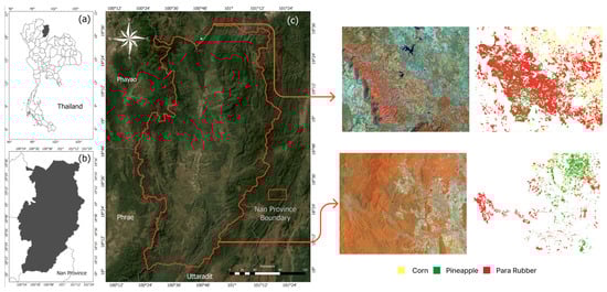 An illustration of a Landsat-8 scene from Northeast Thailand (left) and sample images taken from different scenes in the Thai Landsat dataset (right). Three classes comprise the target of the medium-resolution dataset: para rubber (red), corn (yellow), and pineapple (green).