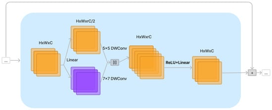 To cope with the challenge, our proposed MeViT still follows a classification-like network topology with a sequential or series architecture. Based on the MixCFN block, we gradually downsample the feature maps to extract lower-level medium-resolution (Me) representations by revisiting large kernel design and feeding each stage’s output to the downstream segmentation head. Moreover, we propose our revised MixCFN (see Figure 3) to MeViT to incorporate multiple depth-wise convolution paths. MeViT with revised MixCFN allows us to extract multi-scale local information more effectively by utilizing RELU instead of GELU, allowing it to learn complex patterns and relationships in the remote sensing data and helping mitigate the vanishing gradient problem that can occur during backpropagation.