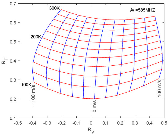 where nL is the total optical path length of the pulsed laser cavity. Considering the mechanical cavity length and optical path difference of the Nd:YAG crystal rod, pucker box and lens comprehensively, the total optical resonance cavity length of the 1064 nm pulse laser is about 2303.19 mm. According to Equation (4), the corresponding longitudinal mode spacing is calculated to be 65 MHz. The integral multiple of closest to 630 MHz is 585 MHz, which enables all three different working laser frequencies to be well matched to the cavity mode of the pulsed laser cavity. Therefore, for the Yanqing Na lidar system, the shift amount () is set to 585 MHz [15]. Figure 1 shows the theoretical 2D calibration curves that convert intensity ratios (RT and Rv) to temperature and LOS wind (T and V) with a frequency shift amount of 585 MHz. For more details on the lidar system, please refer to [15].