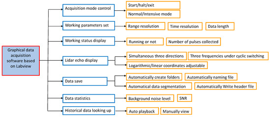 The output laser frequency is cyclically switched among , and . The lidar echoes corresponding to these three different working frequencies are integrated in a cyclical manner. To organize the data storage channels of the three working frequencies, two TTL signals controlling the working sequence are used for classifying and tagging the data. The TTL signals are provided on the tag connector of the data acquisition card and serve as strobe signals. These signals indicate the “active” laser frequency and segment the data memory accordingly. Specifically, the tag bit patterns of 00, 01 and 10 correspond to , and , respectively. When TTL 1 and 2 are low, the lidar echoes corresponding to the working frequency are accumulated in the first segment of the data memory. If TTL 1 is low and TTL 2 is high, the lidar echoes corresponding to working frequency are accumulated in the second segment, and so on. The enabled tag bits to shift the lidar spectrum in memory based on the actual tag input, allowing for the acquisition of three separate spectra, each corresponding to one of the three different working frequencies marked by tag bits. The LabVIEW-based program running on the host computer is used to display and store the data of each storage area. The data file also records operating parameters, such as lidar location, elevation, observational date, starting and ending time, data length and laser repetition frequency, to facilitate secondary data development. Additionally, the data acquisition program integrates a data statistics module that calculates the background noise, Rayleigh scattering signal and Na fluorescence signal in real time to monitor the quality of observational data. The design of the data acquisition program is shown in Figure 2.