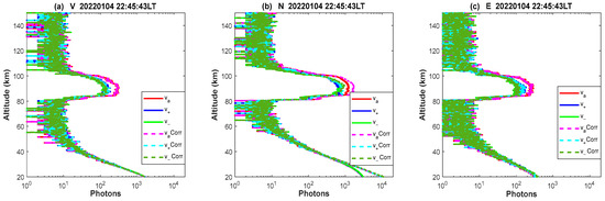 An example of raw photon count profiles (solid lines) obtained at Yanqing, Beijing, on 4 January 2022 and the corresponding profiles after PMT nonlinearity correction (dashed lines) for three laser frequencies (, and ) from three directions (20~150 km): (a) zenith, (b) 30° off zenith to north and (c) 30° off zenith to east.