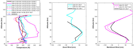 Figure 6a displays an example of the derived temperature profiles measured in three directions before and after PMT correction. The data are processed in 30 min temporal and ~1000 m range resolutions. The temperature results from east and zenith between 82 and 103 km show good consistency, and the results before and after correction are identical (the black and blue dashed and solid lines overlap). A high photon count rate in the north direction without correction produces a large positive temperature deviation up to 40 K in the altitude range of 85~98 km (pink solid line). After correction, the temperature profile in the north direction (the pink dashed line) aligns well with the results obtained from the zenith and east directions. This agreement indicates the feasibility and effectiveness of the data correction method. The Sounding of Atmosphere Broadband Emission Radiometer (SABER) onboard the Thermosphere Ionosphere and Mesosphere Electric Dynamics (TIMED) satellite provides temperature profiles covering the MLT region [28]. Dawkins et al. [29] demonstrated that SABER results were statistically similar to lidar temperature profiles. However, it is important to note that SABER retrieves the temperature from the 15 um CO2 emission, and the local thermodynamic equilibrium (LTE) approximation is not applicable above an altitude of ~75–80 km for the CO2(ν2) vibrational levels involved in the formation of the 15 um radiance. The presence of significant non-LTE effects introduces uncertainty in the calculation of the CO2 vibrational level populations [30,31]. Additionally, there are differences in the sampling size and spatiotemporal collocation between the available SABER and lidar results [29]. Therefore, quantitatively validating the individual lidar-retrieved temperature profiles using SABER results presents significant challenges. In this study, we utilized SABER as an indirect reference to provide auxiliary verification of the effectiveness of the data correction method in reducing potential systematic errors. Figure 6a, shows a SABER temperature profile (red crosses) that we plotted that was sampled during the lidar measurement time interval and was closest to the lidar location. The comparison showed that the lidar temperature profile with correction (pink dashed line) exhibits a similar changing range and trend to the SABER result. Figure 6b,c illustrate the zonal and meridional winds with a resolution of 1 h and ~2 km measured by lidar, respectively. The zonal wind profile (the blue dashed and solid lines overlap, indicating that the east direction was not saturated) essentially agrees with the meteor radar result (black solid line, temporal and height resolution: 1 h, 2 km, 40.3°N, 116.2°E), the wind deviation between them is relatively small, i.e., between 82 and 96 km. However, the originally derived meridional wind without correction (pink solid line) shows significant deviation around 92 km due to the PMT nonlinearity effect of lidar echo from the north direction around the Na layer peak. The PMT nonlinearity correction leads to a more accurate meridional wind profile (pink dashed line) that is closer to the result from radar (black solid line). The temperature and wind results in Figure 6 show that temperature is more sensitive to PMT nonlinearity than wind, a finding that is consistent with previous studies by Liu and Guo [27].