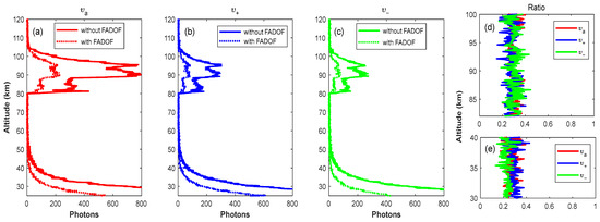 Figure 7a–c show the examples of the photon count profiles at the three operating frequencies before and after inserting the FADOF in the lidar receiver. In a short time, the variation in Na density and temperature can be ignored and the ratio of signals with and without FADOF can be considered mainly caused by the attenuation by the FADOF. The different attenuation by the FADOF for fluorescence and Rayleigh scattering of the three frequencies can be seen in Figure 7d,e. We average over a number of range bins centered at Na layer peak and reference height, for example, between 85 and 95 km for fluorescence and between 29 and 31 km for the Rayleigh signal, to obtain and . It is worth mentioning that, for the simultaneous three-directional measurements, a single-channel FADOF is utilized for each direction in the receiver of the all-solid-state Na lidar, considering the compactness of the detection unit. In comparison to the dual-channel design presented in Xia et al. [32], the transmittance is reduced by half, approximately 0.3, as depicted in Figure 7d,e. After obtaining the correction factors of FADOF attenuation for three frequencies, the temperature and wind measurement ratios, i.e., and , can be given as follows: