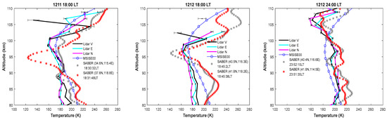 To verify the effectiveness and feasibility of the data correction and retrieval method for diurnal observations of Na Doppler lidar, we compared the derived temperature results with those obtained from the satellite, and the horizontal winds were compared to those obtained by a nearby meteor radar. Figure 9 shows the continuous temperature results with a spatial resolution of ~2 km and temporal resolution of ~1 h, measured by the all-solid-state Na lidar on 11 December 2019. The temperature ranged between 140 and 220 K in the altitude range of 80~105 km, with obvious downward semi-diurnal tidal wave structures observed between 90 and 105 km. Figure 10 presents three examples of the temperature profiles measured by the Na lidar (the solid lines with error bars) and by the SABER (the red and gray asterisks). We selected two SABER profiles that were sampled within a range of ±6° in latitude and ±6° in longitude relative to the lidar site during the lidar valid observational period for each example. The model results from MSIS00 are also included for comparison (the blue solid lines with circles). The sampling time and the position of latitude and longitude of the satellite data are provided in each plot, respectively. The black, light blue and pink solid lines are measured by laser beams pointed towards the zenith, east and north, respectively. The error bars denoted by black short horizontal lines indicate the lidar measurement uncertainty induced by photon noise. As shown in Figure 10, the temperature-changing trends and ranges from the lidar and satellite agree well between 80 and 105 km. The lidar measurement uncertainty due to photon noise is estimated to be ~0.2 K at the sodium peak (around 90 km) and increases to over 1 K at the sodium layer edge (e.g., around 105 km), with a vertical resolution of 2 km and a temporal resolution of 1 h. Since the temporal and altitude resolutions of the temperature profiles detected by the satellite and lidar are quite different (about ~1 min and ~0.4 km for SABER and ~1 h and ~2 km for the Na lidar, respectively), and SABER uses a limb-scanning method, while the lidar is a ground-based observation whose results correspond to different altitudes at the same location. Moreover, there are also differences in the locations (longitude and latitude) between lidar and SABER samplings. The detection difference between them is within a reasonable range, though it is much larger than the measurement uncertainty of the individual profiles.