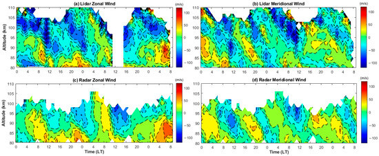 Figure 11a,b show the temporal and height variations of zonal and meridional winds measured simultaneously by the all-solid-state lidar on 11–13 December 2019. Figure 11c,d present the horizontal wind data obtained from a meteor radar (40.3°N, 116.2°E) located approximately 40 km away from the lidar station. Both the lidar and radar results have a range resolution of 2 km and a temporal resolution of 1 h. The trends observed in the lidar and radar wind results are generally consistent. Wavy structures with downward phase progressions are clearly visible in both the zonal and meridional winds. Interestingly, the meridional wind results from both the lidar and radar measurements display more pronounced semi-diurnal tidal wave structures compared to the zonal winds, even though the radar measurements suffer from a higher number of missing valid data points above 100 km. Over the course of the approximately 57-hour measurement period, the maximum meridional wind is observed at around 7 LT on 13 December in the altitude range of 84~91 km, as indicated by both the lidar and radar results. Notably, the lidar measurements reveal more intricate small-scale wave features, as the meteor radar has a larger field of view, while the lidar measures a smaller atmospheric volume.