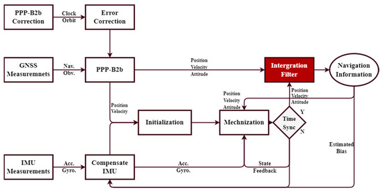 Flowchart of the system for PPP-B2b/INS integration based on the EKF.
