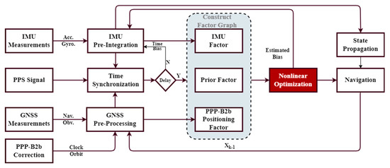 Figure 2 shows the system for PPP-B2b/INS integration based on the FGO. We collect IMU measurements at the input frequencies of 200 Hz for tactical-grade IMU and 100 Hz for MEMS IMU. These measurements are deterministically extended for state variables and related IMU factors on the graph at a rate of 1 Hz. GNSS observations are expected to be available at a rate of 1 Hz as well. We employ the PPS signal from the GNSS receiver to calculate the time delay of the pre-processed GNSS observations. The PPP-B2b correction data needed for GNSS pre-processing is received and processed by the receiver in real-time to generate precise ephemeris. Following each optimization, the estimated IMU biases and re-calibrated gravity information are incorporated back into the IMU preintegration. To provide navigation solutions at a high frequency, we generate a state for each new IMU measurement obtained for the two optimization processes, enabling high-frequency state estimation.