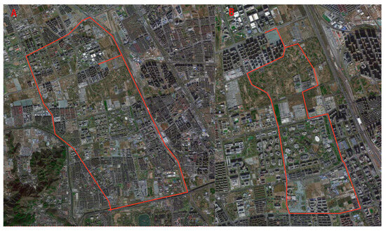 Trajectories of two vehicle experiments. (A,B) Experiment A conduct from 371,514 to 374,911 s of 2269 week in GPS time; Experiment B conduct from 375,476 to 377,401 s of 2269 week in GPS time.