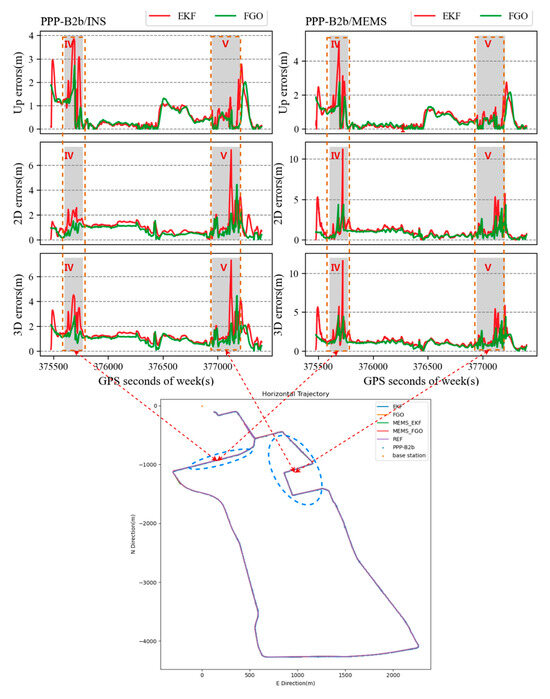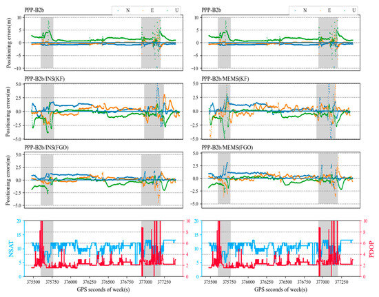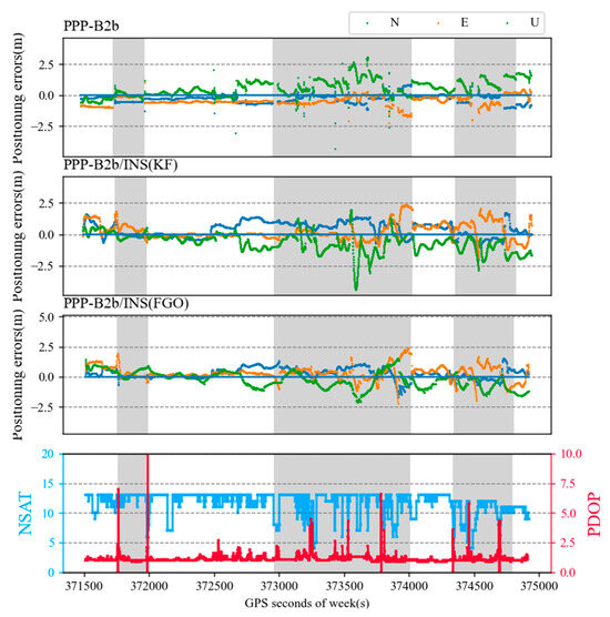 Figure 5 shows the positioning sequences of Experiment A for PPP-B2b and EKF and FGO PPP-B2b/INS integration navigation. The figure also displays the number of available satellites (NSAT) and position dilution of precision (PDOP). The gray area in the diagram represents periods when satellite signals are interrupted or when the quality of satellite observations is poor. Within the initial 15 min after passing two bridges, the number of available GNSS satellites ranged from 11 to 14, and PDOP values were mostly below 2, ensuring continuous and reliable PPP positioning. However, as the vehicle entered a semi-urban operating environment with trees, high-rise buildings, and overpasses, signal tracking became intermittent, and NSAT frequently decreased. Due to frequent signal interruptions, the PPP float ambiguities converged multiple times, typically taking about twenty minutes to converge to a 4 decimeter-level accuracy. However, some outliers appeared in the PPP-B2b positioning sequence, attributed to ambiguity resolution failures. From Figure 5, it can be observed that the occurrence of outliers was accompanied by a decrease in NSAT, an increase in PDOP, or severe multipath errors. Furthermore, all these factors would reduce the accuracy of float ambiguities.