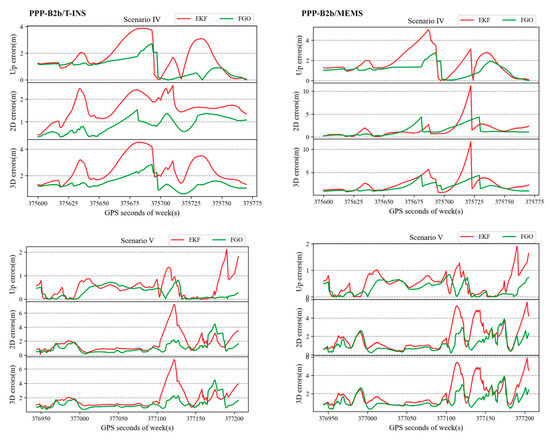 To further compare the positioning performance of two integration navigation algorithms using different grades of IMUs in complex environments, we selected two typical scenarios in urban tree-lined road environments. The scenario IV involves one side of the road being obstructed by trees, resulting in a rapid decrease in the number of visible satellites and prolonged interruptions in the GNSS signal. The scenario V involves obstruction on both sides of the road, leading to frequent short-term signal interruptions and more prominent multipath effects. To quantify the performance of navigation algorithms using different grades of IMUs and different algorithms, we recorded the positional errors over time throughout the entire travel period and during the two typical scenarios. Figure 10 and Figure 11 presents line plots of horizontal errors, zenith direction errors, and 3D errors over time for the entire travel process and during the two typical scenarios. The red lines represent the positioning errors using the EKF algorithm, while the green lines represent the errors using the FGO algorithm. From the graph, we can observe the following: