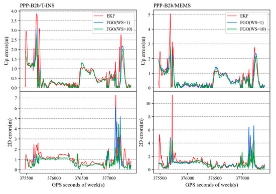 Firstly, for PPP-B2b/INS loosely coupled integration, the EKF typically employs a single iteration to fuse PPP-B2b and INS data. In contrast, the FGO, as a process of determining the optimal estimation based on the gradient, involves multiple iterations within the sliding window and re-linearization, aiming to approach the optimal state [27]. This feature relaxes the requirement for the accuracy of initial estimator guesses and assists in handling non-linear situations. When the FGO window size is set to 1, meaning that the FGO method utilizes measurements from the previous epoch for optimal estimation, it behaves similar to the EKF estimator. In this case, the key difference between the FGO and EKF methods primarily lies in the number of iterations, as shown in Table 7. The FGO method with a window size of 1 (1.150 m and 1.210 m) outperforms the EKF method (1.401 m and 1.444 m) due to a higher number of iterations and re-linearizations, which is a key distinction between these two methods.
