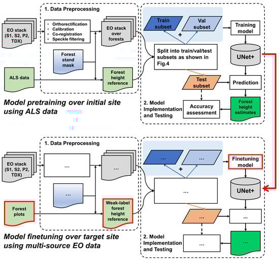 The concept of transfer learning in deep learning involves using a pretrained model on a large dataset as a starting point for training on a new, smaller dataset [27,31,32]. Since both study areas (initial and target sites) are represented by boreal forests, we can safely assume their latent representations strongly overlap in EO feature space, although the specific forest characteristics may be different (considerably more sparse forest in Lapland). This means the prior knowledge learned from the source site can mitigate the negative influence brought by limited reference, e.g., plot-level forest reference that limits inferring spatial context (neighbourhood features). Our hypothesis is that by leveraging the knowledge gained from the pretraining on a spatially explicit dataset, we can achieve better results compared to the end-to-end training from scratch using conventional statistical and machine learning approaches with limited reference forest plot data collected at the new target site.