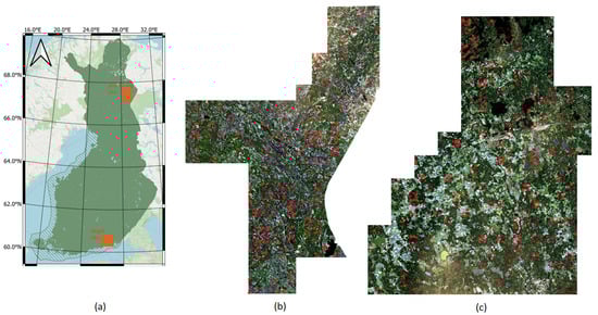 Study site locations in Finland (a), Sentinel-2 natural color composite image over the Salla (pretraining) site (b), and over the Kouvola (target) site (c). Red dots designate forest plot locations.