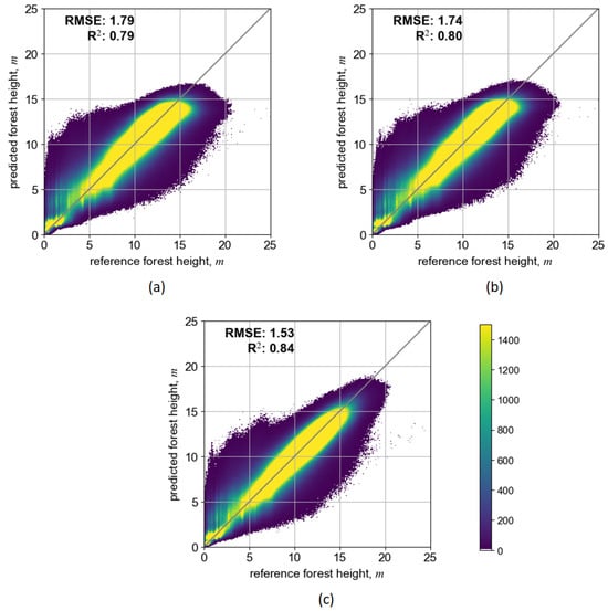 Scatterplots illustrating prediction performance of pretrained SeUNet model using ALS reference data: (a) S2-Lapland model, (b) S1S2-Lapland model, (c) MS-Lapland model.