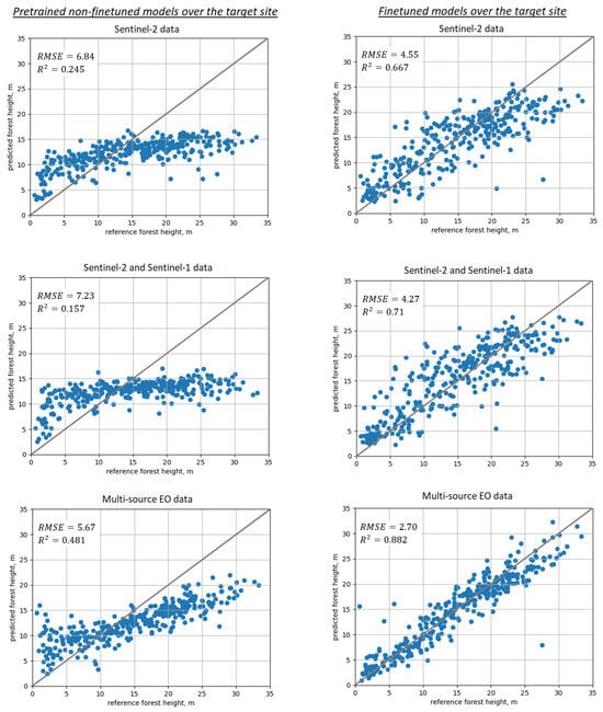 Results of “blindly” applying pretrained models (without fine-tuning with in situ forest plots) over the target Kouvola site are shown in the upper row of Figure 6. Prediction performance is not satisfactory, with RMSE in the range 5–7 m (40–50% rRMSE), strong negative systematic prediction error of 2.3–2.8 m present in all model predictions and apparent signal-saturation effects clearly visible for taller trees. Such performance can be attributed to differences in both forest structure and EO images (spectral, calibration, seasonal changes). Similar effects could be expected if the target site was the same as pretraining, and only EO images acquired at another time were used in the prediction (i.e., at least the forest structure would be the same). Prediction performance was problematic for all non-fine-tuned DL models and EO data inputs, with slightly more accurate predictions for the MS-Lapland model.