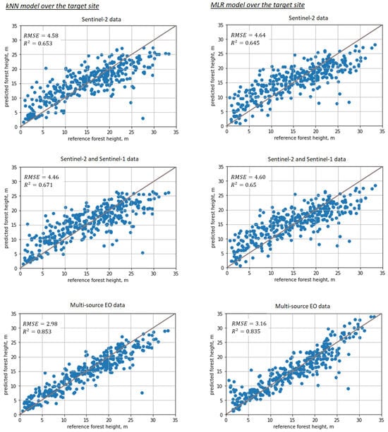 Scatterplots illustrating prediction performance for baseline methods: 1st column—kNN, 2nd column—MLR; 1st row—Sentinel-2 data; 2nd row—combined Sentinel-2 and Sentinel-1 images; 3rd row—all available images (Sentinel-2, Sentinel-1, ALOS-2 PALSAR-2, TanDEM-X).