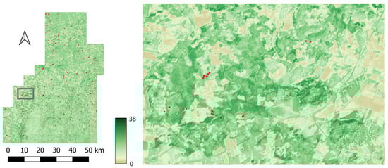Predicted forest height map over the Kouvola (target) site and zoomed in fragment. SeUNet model has been used in the prediction.