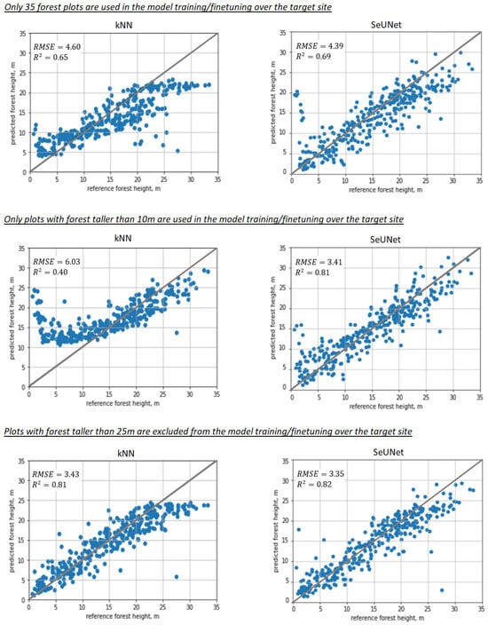 The difference in R2 and RMSE is substantial between fine-tuned SeUNet and kNN methods, but most importantly, the range of predicted heights is distorted, and predictions cannot understandably reach certain (small or large) values that fall out of the range of forest plot measurements. For example, when young forest plots are missing in the training set (Figure 9, 2nd column), kNN fails to produce any estimates less than 10 m. The same effect can be observed for forest plots with tall trees, with the tallest predictions of ∼25 m for kNN, while the SeUNet predictions reach 30 m. When a small number of plots is used, kNN predictions start to approach the average height. The effect would become even more pronounced if the number of plots is decreased further, e.g., to 10 reference plots. The model transfer is still expected to work in that situation, provided that the reference dataset for the target site includes sample units with short and tall forests.
