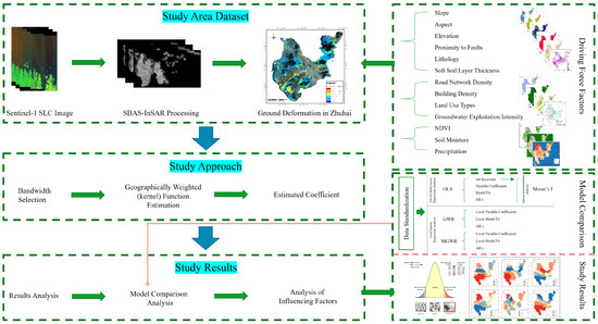 Multiple data sets and methods were used in this study. At first, the SBAS-InSAR technique was used to acquire the ground deformation data and spatial distribution of Zhuhai City. Then, the effects of the influencing factors on ground deformation were analyzed by building a regression model. Evaluation metrics such as R-sq, AICc, and residual sum of squares (RSS) were used to validate the MGWR model, and its performance was compared to that of the OLS and GWR methods. Finally, the model results were used to conduct a quantitative analysis of the factors that contributed. Figure 2 shows the study framework for this paper.