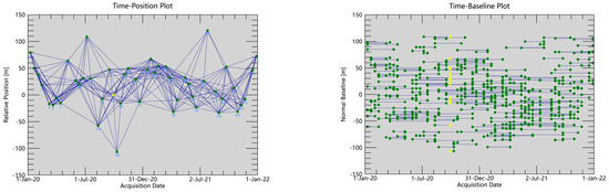 For this research, 48 views of Sentinel-1A images from January 2020 to December 2021 that covered the study area were used. Subsequently, we processed these images using SARscape software in ENVI 5.3, combining all possible interfering pairs, selecting the image acquired on 28 September 2020 as the super-master image, and setting the maximum spatio-temporal baseline to 120 to generate the optimal spatio-temporal baseline connectivity maps and interfering pair connectivity maps (as shown in Figure 3). At the same time, the interfering pairs with low coherence were also removed. The development of interference diagrams, flatness correction, filtering, coherent diagram synthesis, and phase unwrapping were all parts of the interference process. This study selected the GCP points using automatic selection during PS-InSAR processing to improve the accuracy of the results and minimize undue human influence. A digital elevation model with 12.5 m accuracy was used for terrain phase removal and alignment in the processing; a Goldstein filter was used to improve the signal-to-noise ratio of the interferogram; the true phase of the highly coherent pixels was obtained using the minimum cost flow (MCF) algorithm; the deformation rate in the study area was estimated using a linear model; and the final deformation rate was obtained by removing the atmospheric phase.