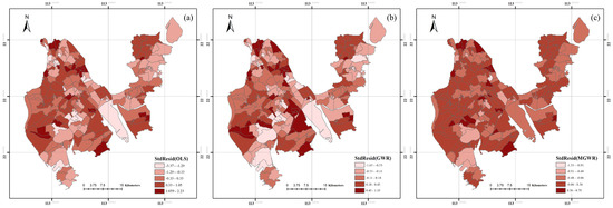 Figure 6 displays the distribution of the three models’ regression residuals. The comparison reveals that the regression residuals of the MGWR model are generally smaller and exhibit a more random spatial distribution, indicating that the model is well-suited for most regions. In contrast, the regression residuals of the other two models are relatively large and display some spatial structure.