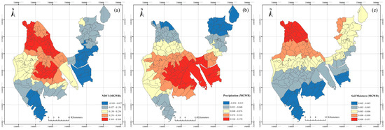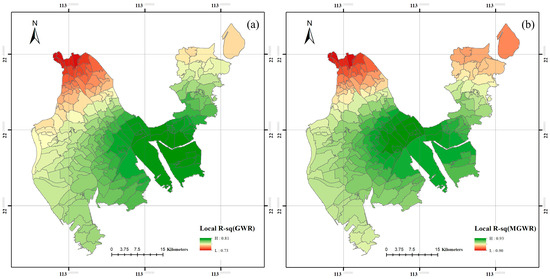 Allowing each explanatory variable to have a different bandwidth removes the limitation that all relationships at each spatial location vary on the same spatial scale. This also reduces overfitting and bias in parameter estimations during model fitting. It is worth emphasizing that we utilized MGWR software developed by Oshan [60] for implementing the MGWR method, while we utilized ArcGIS 10.7 software to obtain the results of the global regression model (OLS). In addition, for the MGWR analysis, we utilized the golden section method for bandwidth selection, opted for the Gaussian function as the model, and utilized AICc as the model optimization criterion to ensure the high accuracy and reliability of our model. Ultimately, we compared the global and local models to provide a more accurate assessment of overfitting and bias in the parameter estimates.