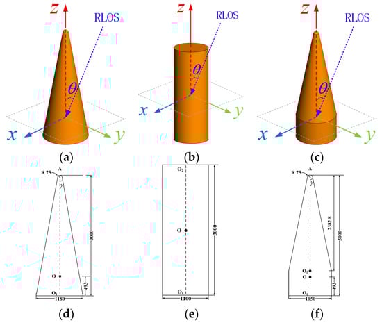 CAD models and sectional drawings of cone-shaped target, cylinder-shaped target, and cone-cylinder-shaped target. (a–c) are their CAD models. (d–f) are their sectional drawings.