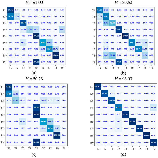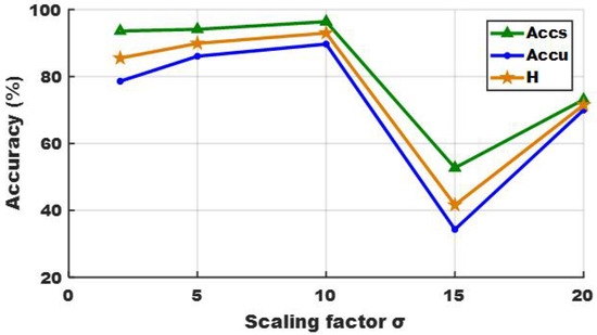 We vary in (12) within the range of , as shown in Figure 11. As increases, H gradually increases until , when our method performs best. However, as A continues to increase, H decreases. Therefore, we choose .