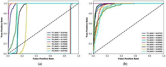 Recognition accuracy can reflect the relationship between the number of correctly classified test samples and the total number of test samples. However, it does not reflect the relationship between misclassification rate (the probability of classifying a false sample as true) and sensitivity (the probability of classifying a true sample as true). Therefore, we evaluate the recognition effect by using ROC curves and AUC. The closer the ROC curve is to the upper left corner of the graph, the better the classification performance of one model, and the corresponding AUC value of one model is close to 1. Figure 8 shows the ROC curves and corresponding AUC values of the comparison methods under the 7/2 condition in Table 5. The ROC curve of GLVFENet is closer to the upper left corner than the ROC curves of the other models. The corresponding AUC value is also larger, indicating that GLVFENet performs well in zero-shot classification tasks.