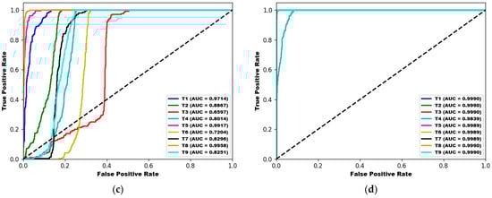 ROC curves and AUC of different methods. (a) HSVA, (b) APN, (c) DPPN, (d) GLVFENet.