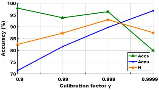 denotes the scaling factor in the loss of GVFE-Subnet, and Figure 9 illustrates the effect of varying over the range on the model performance. As gradually increases, , , and H increase until , where , , and H reach their highest values of 96.4%, 89.7%, and 93.0%, respectively. As further increases, , , and H show a downward trend. For this reason, we choose , when the model performs best.