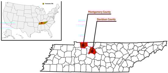 In an effort to critically evaluate the capabilities of the Community Climate Change Impacts Service (C3IS) toolkit, the climatic and meteorological nuances of two counties, Davidson and Montgomery (Figure 1), located in Tennessee, USA, were examined. These counties contain the bustling cities of Nashville and Clarksville, geographically separated between 36°31′54.0″ and 36°09′31.8″N latitude and 87°21′29.4″ and 86°47′10.7″W longitude.