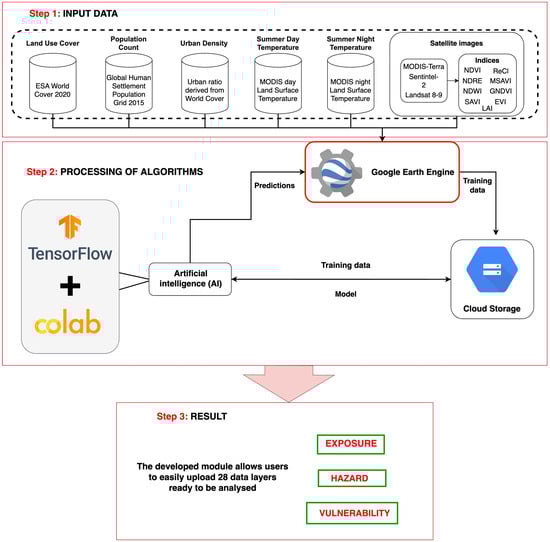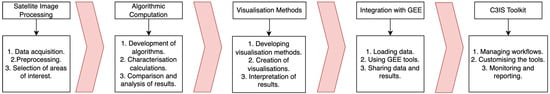 This study used a methodological scheme characterised by the holistic integration of satellite image processing, algorithmic computation and visualisation techniques in the Google Earth Engine ecosystem [16]. An integral aspect of this methodological design is a clear structured diagram explaining the workflow of the C3IS toolkit (Figure 2).