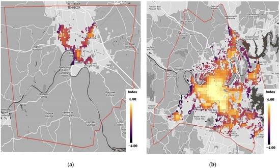 Figure 4a shows the distribution of TRP intensity within Montgomery County. It can be seen that the main heat centres are concentrated in the central and industrial areas of the county. Figure 4b, illustrating Davidson County, shows that there are similar trends but with some peculiarities in the distribution of heat zones possibly due to the differences in the layout and infrastructure of the two counties.