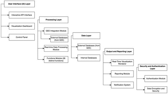 Taking a deeper look, the processing layer acts as the driving force behind the system. Here, the Google Earth Engine’s integration module acquires the necessary geospatial data and images and passes them to the real-time processing module. The 28 different system functions in the Functions module then process these data, analysing and interpreting it according to the user’s request.