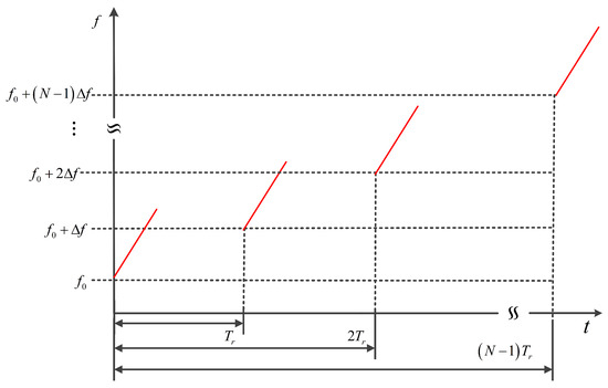 where is the subpulse number, m is the frame number (), M is the total number of frames used for coherent accumulation, N is the number of subpulses in each frame of the echo, and h is the sequence number of the subpulse in the frame. is the fast time, is the pulse width, and . is the frequency modulation slope. is the carrier frequency of each subpulse (); is the initial carrier frequency. is the stepped-frequency interval, is the pulse repetition period (PRT), and the accumulation time is .
