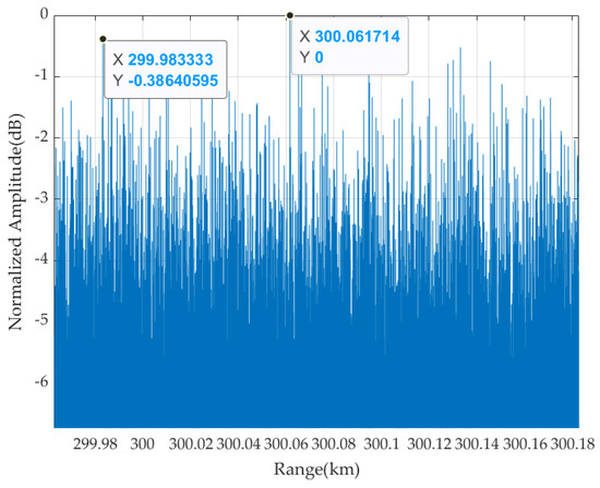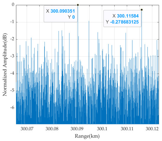 Figure 14 and Figure 15 show the target motion parameters estimated by the DGRFT algorithm. The initial target velocity is estimated at 18.97 m/s with an error of 31.03 m/s, and the target acceleration is estimated at 9.10 m/s with an error of 4.10 m/s. Figure 16 shows the target HRRP obtained after motion compensation, time-domain splicing, synthetic wideband processing, and coherent accumulation. The following results were obtained using the conventional DGRFT algorithm: the two scattering points of the target were submerged in noise, and the two peaks of HRRP appeared at 300.090351 km and 300.115840 km. Therefore, the HRRP was not correctly focused.