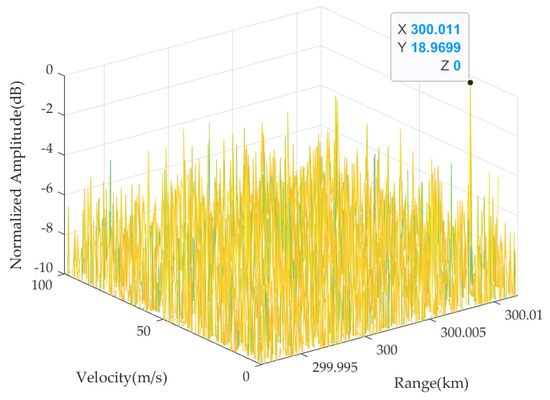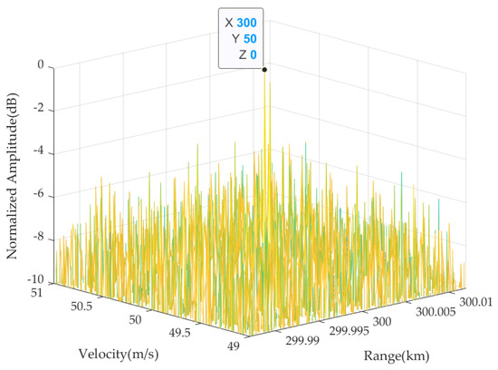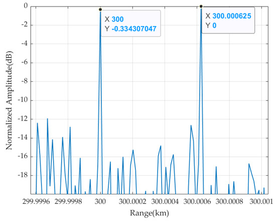 Table 1 shows the main parameters and target characteristics of the simulated radar system. To carry out a detailed comparison of the performances of the stepped DRFT and conventional DRFT algorithms, the signal carrier frequency in the simulation was set to hop linearly at a fixed stepped-frequency interval within a step cycle. The target moved at a constant velocity and consisted of two equal-intensity scattering points with initial radial ranges of 300 km and 300.000625 km. The target spanned a total of 12 range units throughout the entire accumulation period, and there was a clear ARU phenomenon. To endow the target with weak characteristics, Gaussian white noise was added to the echo such that the dechirp-receiving FFT yielded an echo with an SNR of −10 dB.