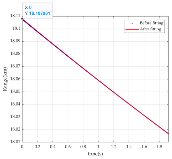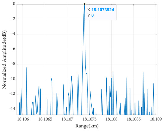 For stepped DGRFT and conventional DGRFT, the velocity search range was set to 0–200 m/s, and the acceleration search range was set to −10 to 10 m/s. Figure 17 and Figure 18 show the target motion parameters estimated using the stepped DGRFT algorithm. The initial target velocity was estimated at 49.639 m/s, and the target acceleration was estimated at −2.528 m/s. The estimated motion parameters were used to perform motion compensation on the target. Figure 19 and Figure 20 show the target HRRP obtained after motion compensation, time-domain splicing, synthetic wideband processing, and coherent accumulation, where the target position was 18.107392 km. No noise was added to the measured data, and the target ranging method based on the peak points was used to measure the target. The initial range of the target obtained by fitting is 18.107981 km. The fitted ranging results are shown in Figure 21. The proposed algorithm achieves accurate estimation and compensation of the target parameters. The main scattering point of the target HRRP obtained after coherent accumulation is accurately located, and the HRRP is well focused.