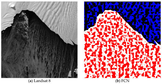 Model classification result. (a) Landsat 8 image in Pine Island Glacier. (b) FCN result. (c) U-Net result. (d) U2-Net result. The black, white, blue, and red pixels in (b–d) represent TP, TN, FP, and FN, respectively.