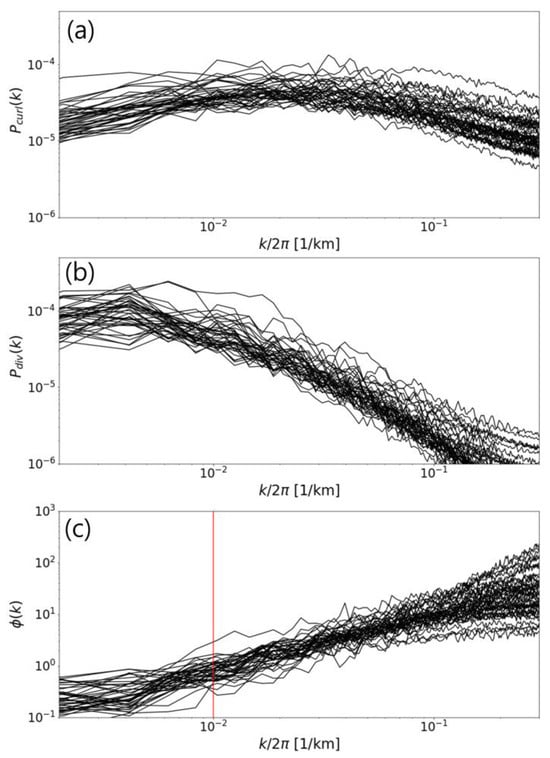 To examine the motion characteristics of the precipitation events, we conducted Fourier analysis on the decomposed field components and . Using the power spectra of the curl component () and the divergence component () obtained through Fourier transform, we computed the radially averaged power spectra (see also [] and the references therein), and , as follows: