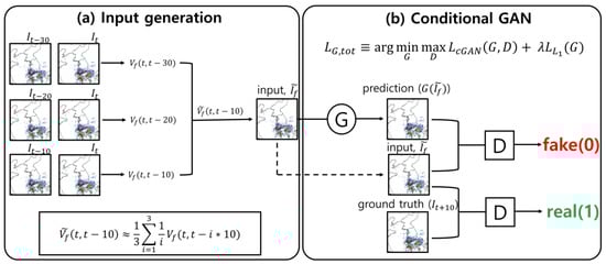 Recently, deep learning-based methods using optical flow technique have been reported to capture nonlinear motions, both in computer vision [,,,,] and atmospheric science using satellite imagery []. These methods extract time-sequence input features using deep learning networks to track nonlinear evolution, which cannot be captured by the optical flow algorithm alone. In this study, we adopted these approaches to advance the precipitation nowcasting model based on advection through the optical flow method. Specifically, the model proposed in this study is divided into two parts: (1) input image generation by linear extrapolation using multi-temporal optical flow fields, and (2) a conditional GAN for capturing the features of nonlinear evolution that are not included in the linear extrapolated input image. The forecasting skills of the model were evaluated using both quantitative and qualitative methods.