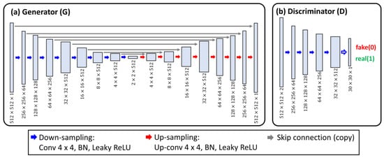 We employed Pix2Pix [] for the cGAN implementation, which contains a generator based on the U-Net [] architecture to create and a discriminator based on patch-GAN to compare and . Figure 4 depicts the structure of the generator (G) and discriminator (D). In the Pix2Pix model, G minimizes the loss function when G is trained to produce the image, from input (). By contrast, D maximizes . can be expressed as follows: