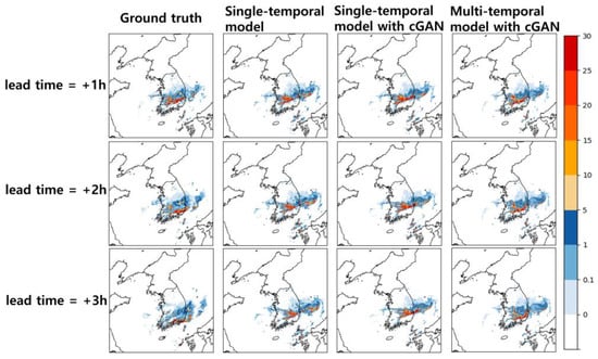 Figure 9 presents the CSI, POD, and FAR scores at the thresholds of and . Based on the CSI and POD evaluations, the accuracy is influenced by the presence of both the multi-temporal optical flow field and cGAN. When compared to the single-temporal model without cGAN, the CSI values for the single-temporal model with cGAN and the multi-temporal model without cGAN show improvement within 0–3 h lead times. Furthermore, when both the multi-temporal optical flow and cGAN are considered together, the performance enhancement becomes more significant, as indicated by the red solid lines in Figure 9. For example, when compared to the single-temporal optical flow model, the multi-temporal model with cGAN enhances accuracy by approximately in predicting heavy rainfall events with at 1–3 h lead times. In contrast, the multi-temporal model without cGAN shows an improvement of approximately . In this context, it would be possible to further enhance currently operational nowcasting models at KMA based on MAPLE by incorporating the cGAN. Note that the prediction accuracy in terms of the CSI can be improved when the predicted rainfall intensity is overestimated. However, based on the FAR scores, we interpreted the enhancement of CSI scores as independent of such effects. Because the FAR of the multi-temporal model with cGAN is generally lower than that of the other models, we interpret that the multi-temporal model with the cGAN does not overestimate the area or intensity of rainfall.