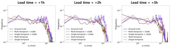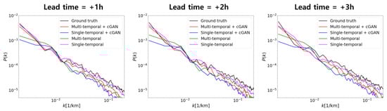 To test the operational feasibility of the model with the cGAN, we examined the blurry effects of the nowcasting model by calculating the radially averaged power spectra of the precipitation fields. Figure 7 shows the power spectra of the same sample at 1–3 h lead times. We noted that the models with cGAN show slightly blurry forecasts in the scale of due to the adversarial loss function, . Despite the blurry effects of the model with cGAN, we interpret that the models with cGAN could be applicable for precipitation nowcasting, because such blurry effects are independent of the lead time whereas the blurry effects of the model based on the U-Net convolution neural network are more prominent as the lead time increases.